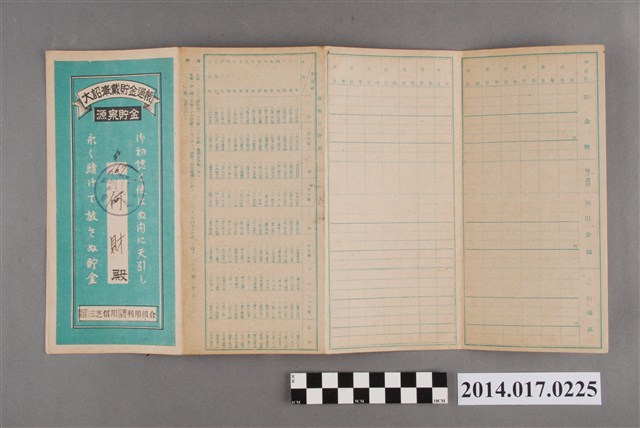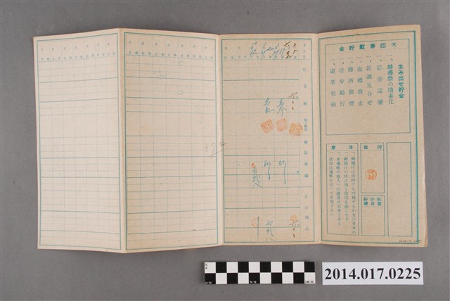 本物件為戰爭期間1943年~1945年期間後龍、公司寮、水尾子、二張犁、大山腳、頭湖、崎頂等地人民之銷帳儲金簿,內頁印有大詔奉戴字樣,並以婚葬儀式簡化、宴會遠慮、新謁見合せ、虛禮廢止、節酒節煙、徒步勵行、副業勉強倡導儲金,另外印有儲簿規定如:不許轉讓、改印需申請等,背頁附有複利合計表。大詔指的是1941年對美、英兩國之宣戰詔書,1942年起每個月8日定為大詔奉戴日,為日本政府為太平洋戰爭所運作的國民運動,隨著戰爭規模擴大,戰時有各項國民強迫儲蓄的舉措,以支援前線戰事,1938年日本政府為因應中日戰爭即推行有愛國儲蓄運動,本物件則為1942年後因應戰爭規模擴大後之儲蓄項目,范雅鈞指出本儲金簿為強制存款,直接由薪資扣除。