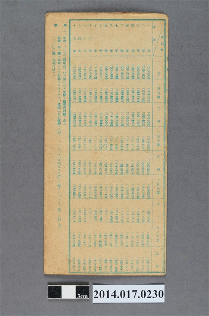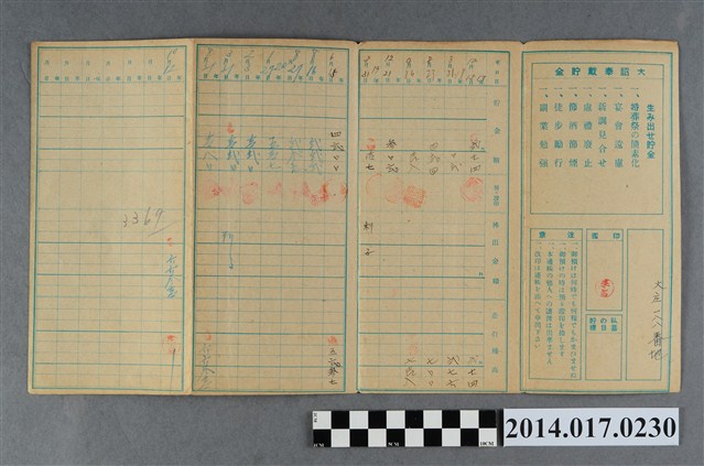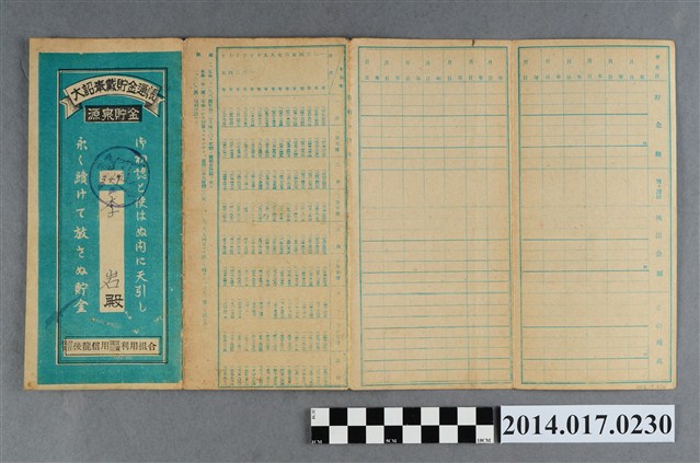 地址載為大庄188番地。本物件為戰爭期間1943年~1945年期間後龍、公司寮、水尾子、二張犁、大山腳、頭湖、崎頂等地人民之銷帳儲金簿,內頁印有大詔奉戴字樣,並以婚葬儀式簡化、宴會遠慮、新謁見合せ、虛禮廢止、節酒節煙、徒步勵行、副業勉強倡導儲金,另外印有儲簿規定如:不許轉讓、改印需申請等,背頁附有複利合計表。大詔指的是1941年對美、英兩國之宣戰詔書,1942年起每個月8日定為大詔奉戴日,為日本政府為太平洋戰爭所運作的國民運動,隨著戰爭規模擴大,戰時有各項國民強迫儲蓄的舉措,以支援前線戰事,1938年日本政府為因應中日戰爭即推行有愛國儲蓄運動,本物件則為1942年後因應戰爭規模擴大後之儲蓄項目,范雅鈞指出本儲金簿為強制存款,直接由薪資扣除。