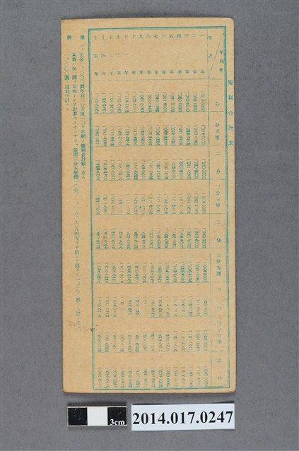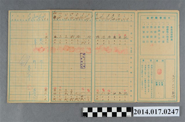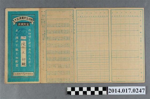 地址載為大山ア370。本物件為戰爭期間1943年~1945年期間後龍、公司寮、水尾子、二張犁、大山腳、頭湖、崎頂等地人民之銷帳儲金簿,內頁印有大詔奉戴字樣,並以婚葬儀式簡化、宴會遠慮、新謁見合せ、虛禮廢止、節酒節煙、徒步勵行、副業勉強倡導儲金,另外印有儲簿規定如:不許轉讓、改印需申請等,背頁附有複利合計表。大詔指的是1941年對美、英兩國之宣戰詔書,1942年起每個月8日定為大詔奉戴日,為日本政府為太平洋戰爭所運作的國民運動,隨著戰爭規模擴大,戰時有各項國民強迫儲蓄的舉措,以支援前線戰事,1938年日本政府為因應中日戰爭即推行有愛國儲蓄運動,本物件則為1942年後因應戰爭規模擴大後之儲蓄項目,范雅鈞指出本儲金簿為強制存款,直接由薪資扣除。