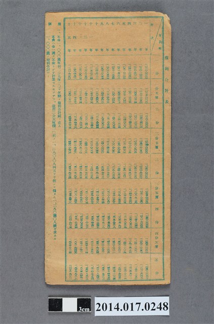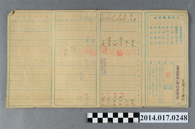 地址載為後龍156番地。本物件為戰爭期間1943年~1945年期間後龍、公司寮、水尾子、二張犁、大山腳、頭湖、崎頂等地人民之銷帳儲金簿,內頁印有大詔奉戴字樣,並以婚葬儀式簡化、宴會遠慮、新謁見合せ、虛禮廢止、節酒節煙、徒步勵行、副業勉強倡導儲金,另外印有儲簿規定如:不許轉讓、改印需申請等,背頁附有複利合計表。大詔指的是1941年對美、英兩國之宣戰詔書,1942年起每個月8日定為大詔奉戴日,為日本政府為太平洋戰爭所運作的國民運動,隨著戰爭規模擴大,戰時有各項國民強迫儲蓄的舉措,以支援前線戰事,1938年日本政府為因應中日戰爭即推行有愛國儲蓄運動,本物件則為1942年後因應戰爭規模擴大後之儲蓄項目,范雅鈞指出本儲金簿為強制存款,直接由薪資扣除。