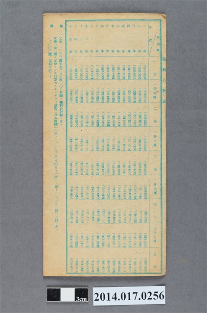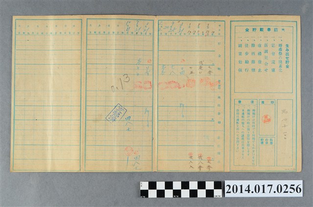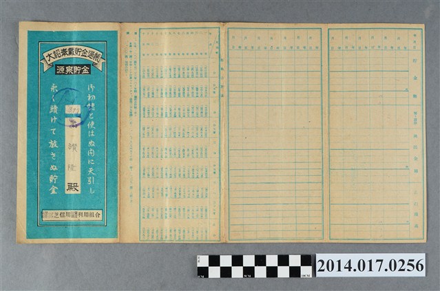 地址載為田心子100。本物件為戰爭期間1943年~1945年期間後龍、公司寮、水尾子、二張犁、大山腳、頭湖、崎頂等地人民之銷帳儲金簿,內頁印有大詔奉戴字樣,並以婚葬儀式簡化、宴會遠慮、新謁見合せ、虛禮廢止、節酒節煙、徒步勵行、副業勉強倡導儲金,另外印有儲簿規定如:不許轉讓、改印需申請等,背頁附有複利合計表。大詔指的是1941年對美、英兩國之宣戰詔書,1942年起每個月8日定為大詔奉戴日,為日本政府為太平洋戰爭所運作的國民運動,隨著戰爭規模擴大,戰時有各項國民強迫儲蓄的舉措,以支援前線戰事,1938年日本政府為因應中日戰爭即推行有愛國儲蓄運動,本物件則為1942年後因應戰爭規模擴大後之儲蓄項目,范雅鈞指出本儲金簿為強制存款,直接由薪資扣除。