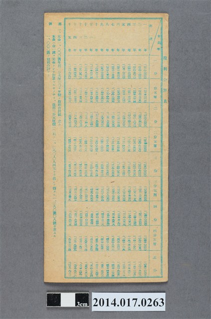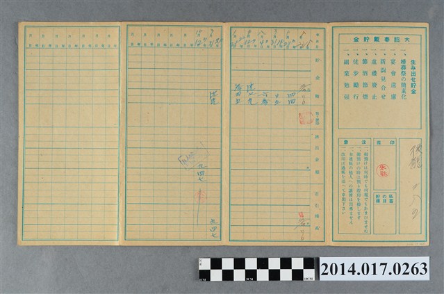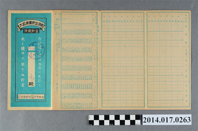 地址載為後龍285。本物件為戰爭期間1943年~1945年期間後龍、公司寮、水尾子、二張犁、大山腳、頭湖、崎頂等地人民之銷帳儲金簿,內頁印有大詔奉戴字樣,並以婚葬儀式簡化、宴會遠慮、新謁見合せ、虛禮廢止、節酒節煙、徒步勵行、副業勉強倡導儲金,另外印有儲簿規定如:不許轉讓、改印需申請等,背頁附有複利合計表。大詔指的是1941年對美、英兩國之宣戰詔書,1942年起每個月8日定為大詔奉戴日,為日本政府為太平洋戰爭所運作的國民運動,隨著戰爭規模擴大,戰時有各項國民強迫儲蓄的舉措,以支援前線戰事,1938年日本政府為因應中日戰爭即推行有愛國儲蓄運動,本物件則為1942年後因應戰爭規模擴大後之儲蓄項目,范雅鈞指出本儲金簿為強制存款,直接由薪資扣除。