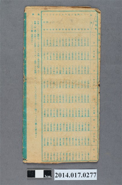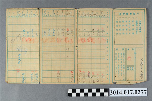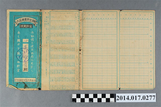地址載為大山ア616番地。本物件為戰爭期間1943年~1945年期間後龍、公司寮、水尾子、二張犁、大山腳、頭湖、崎頂等地人民之銷帳儲金簿,內頁印有大詔奉戴字樣,並以婚葬儀式簡化、宴會遠慮、新謁見合せ、虛禮廢止、節酒節煙、徒步勵行、副業勉強倡導儲金,另外印有儲簿規定如:不許轉讓、改印需申請等,背頁附有複利合計表。大詔指的是1941年對美、英兩國之宣戰詔書,1942年起每個月8日定為大詔奉戴日,為日本政府為太平洋戰爭所運作的國民運動,隨著戰爭規模擴大,戰時有各項國民強迫儲蓄的舉措,以支援前線戰事,1938年日本政府為因應中日戰爭即推行有愛國儲蓄運動,本物件則為1942年後因應戰爭規模擴大後之儲蓄項目,范雅鈞指出本儲金簿為強制存款,直接由薪資扣除。