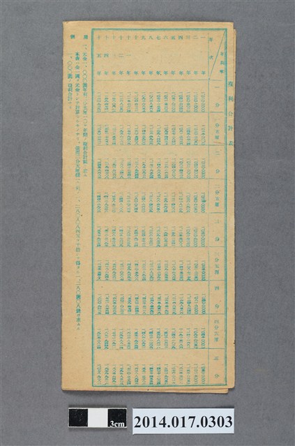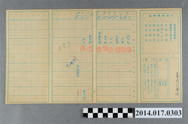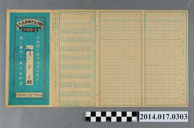 地址載為後龍底126番地。本物件為戰爭期間1943年~1945年期間後龍、公司寮、水尾子、二張犁、大山腳、頭湖、崎頂等地人民之銷帳儲金簿,內頁印有大詔奉戴字樣,並以婚葬儀式簡化、宴會遠慮、新謁見合せ、虛禮廢止、節酒節煙、徒步勵行、副業勉強倡導儲金,另外印有儲簿規定如:不許轉讓、改印需申請等,背頁附有複利合計表。大詔指的是1941年對美、英兩國之宣戰詔書,1942年起每個月8日定為大詔奉戴日,為日本政府為太平洋戰爭所運作的國民運動,隨著戰爭規模擴大,戰時有各項國民強迫儲蓄的舉措,以支援前線戰事,1938年日本政府為因應中日戰爭即推行有愛國儲蓄運動,本物件則為1942年後因應戰爭規模擴大後之儲蓄項目,范雅鈞指出本儲金簿為強制存款,直接由薪資扣除。