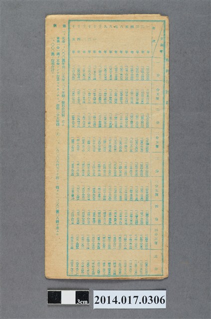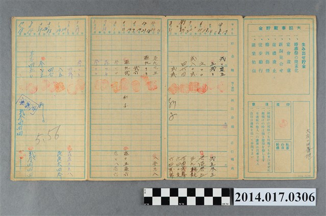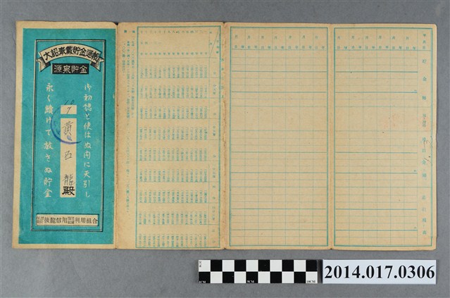 地址載為大庄24番地。本物件為戰爭期間1943年~1945年期間後龍、公司寮、水尾子、二張犁、大山腳、頭湖、崎頂等地人民之銷帳儲金簿,內頁印有大詔奉戴字樣,並以婚葬儀式簡化、宴會遠慮、新謁見合せ、虛禮廢止、節酒節煙、徒步勵行、副業勉強倡導儲金,另外印有儲簿規定如:不許轉讓、改印需申請等,背頁附有複利合計表。大詔指的是1941年對美、英兩國之宣戰詔書,1942年起每個月8日定為大詔奉戴日,為日本政府為太平洋戰爭所運作的國民運動,隨著戰爭規模擴大,戰時有各項國民強迫儲蓄的舉措,以支援前線戰事,1938年日本政府為因應中日戰爭即推行有愛國儲蓄運動,本物件則為1942年後因應戰爭規模擴大後之儲蓄項目,范雅鈞指出本儲金簿為強制存款,直接由薪資扣除。