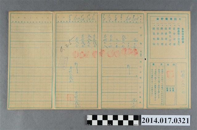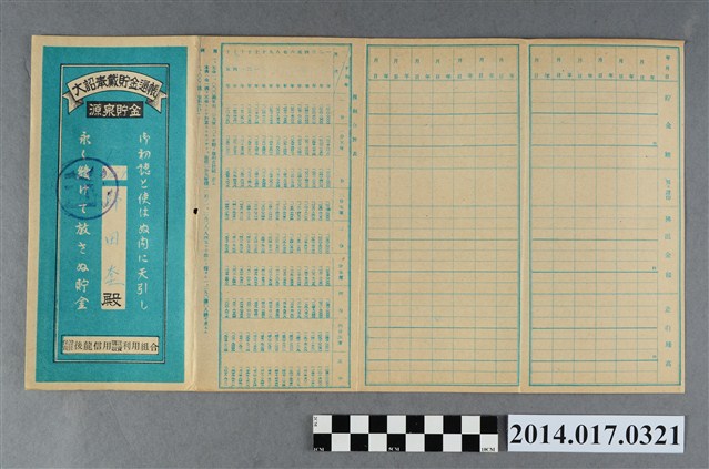 地址載為竹南281之7。本物件為戰爭期間1943年~1945年期間後龍、公司寮、水尾子、二張犁、大山腳、頭湖、崎頂等地人民之銷帳儲金簿,內頁印有大詔奉戴字樣,並以婚葬儀式簡化、宴會遠慮、新謁見合せ、虛禮廢止、節酒節煙、徒步勵行、副業勉強倡導儲金,另外印有儲簿規定如:不許轉讓、改印需申請等,背頁附有複利合計表。大詔指的是1941年對美、英兩國之宣戰詔書,1942年起每個月8日定為大詔奉戴日,為日本政府為太平洋戰爭所運作的國民運動,隨著戰爭規模擴大,戰時有各項國民強迫儲蓄的舉措,以支援前線戰事,1938年日本政府為因應中日戰爭即推行有愛國儲蓄運動,本物件則為1942年後因應戰爭規模擴大後之儲蓄項目,范雅鈞指出本儲金簿為強制存款,直接由薪資扣除。
