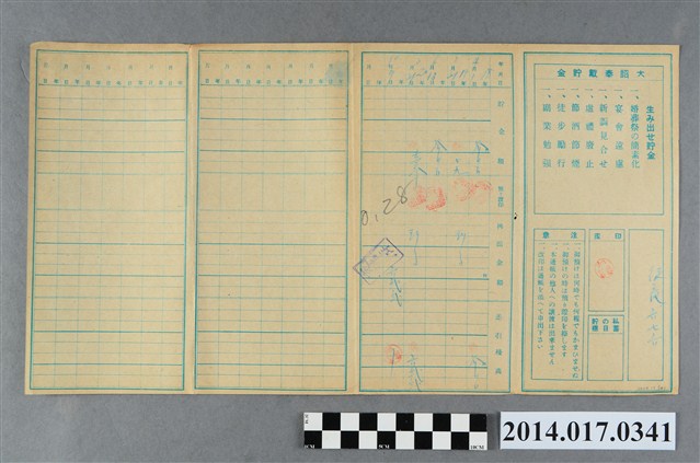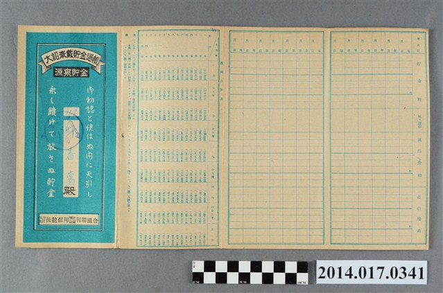 地址載為後龍676。本物件為戰爭期間1943年~1945年期間後龍、公司寮、水尾子、二張犁、大山腳、頭湖、崎頂等地人民之銷帳儲金簿,內頁印有大詔奉戴字樣,並以婚葬儀式簡化、宴會遠慮、新謁見合せ、虛禮廢止、節酒節煙、徒步勵行、副業勉強倡導儲金,另外印有儲簿規定如:不許轉讓、改印需申請等,背頁附有複利合計表。大詔指的是1941年對美、英兩國之宣戰詔書,1942年起每個月8日定為大詔奉戴日,為日本政府為太平洋戰爭所運作的國民運動,隨著戰爭規模擴大,戰時有各項國民強迫儲蓄的舉措,以支援前線戰事,1938年日本政府為因應中日戰爭即推行有愛國儲蓄運動,本物件則為1942年後因應戰爭規模擴大後之儲蓄項目,范雅鈞指出本儲金簿為強制存款,直接由薪資扣除。