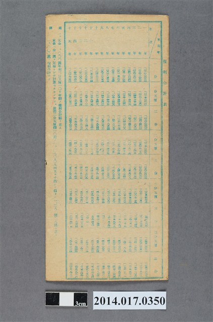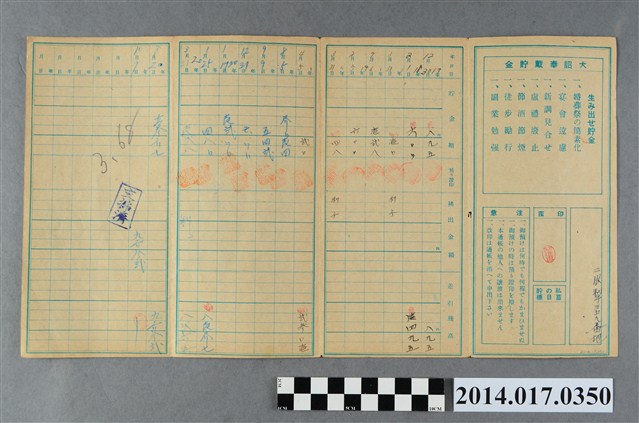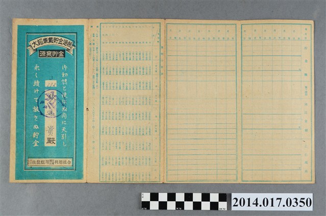 地址登載為二張犁359。本物件為戰爭期間1943年~1945年期間後龍、公司寮、水尾子、二張犁、大山腳、頭湖、崎頂等地人民之銷帳儲金簿,內頁印有大詔奉戴字樣,並以婚葬儀式簡化、宴會遠慮、新謁見合せ、虛禮廢止、節酒節煙、徒步勵行、副業勉強倡導儲金,另外印有儲簿規定如:不許轉讓、改印需申請等,背頁附有複利合計表。大詔指的是1941年對美、英兩國之宣戰詔書,1942年起每個月8日定為大詔奉戴日,為日本政府為太平洋戰爭所運作的國民運動,隨著戰爭規模擴大,戰時有各項國民強迫儲蓄的舉措,以支援前線戰事,1938年日本政府為因應中日戰爭即推行有愛國儲蓄運動,本物件則為1942年後因應戰爭規模擴大後之儲蓄項目,范雅鈞指出本儲金簿為強制存款,直接由薪資扣除。