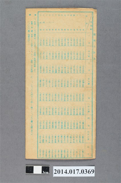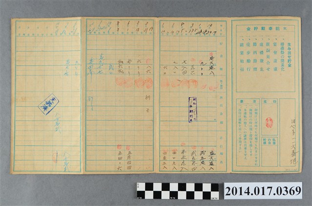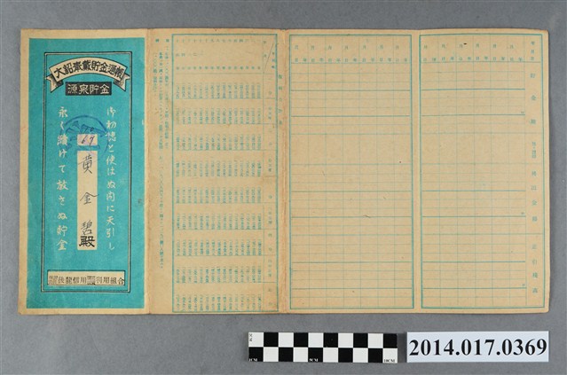 地址處載有公司寮116番地。本物件為戰爭期間1943年~1945年期間後龍、公司寮、水尾子、二張犁、大山腳、頭湖、崎頂等地人民之銷帳儲金簿,內頁印有大詔奉戴字樣,並以婚葬儀式簡化、宴會遠慮、新謁見合せ、虛禮廢止、節酒節煙、徒步勵行、副業勉強倡導儲金,另外印有儲簿規定如:不許轉讓、改印需申請等,背頁附有複利合計表。大詔指的是1941年對美、英兩國之宣戰詔書,1942年起每個月8日定為大詔奉戴日,為日本政府為太平洋戰爭所運作的國民運動,隨著戰爭規模擴大,戰時有各項國民強迫儲蓄的舉措,以支援前線戰事,1938年日本政府為因應中日戰爭即推行有愛國儲蓄運動,本物件則為1942年後因應戰爭規模擴大後之儲蓄項目,范雅鈞指出本儲金簿為強制存款,直接由薪資扣除。