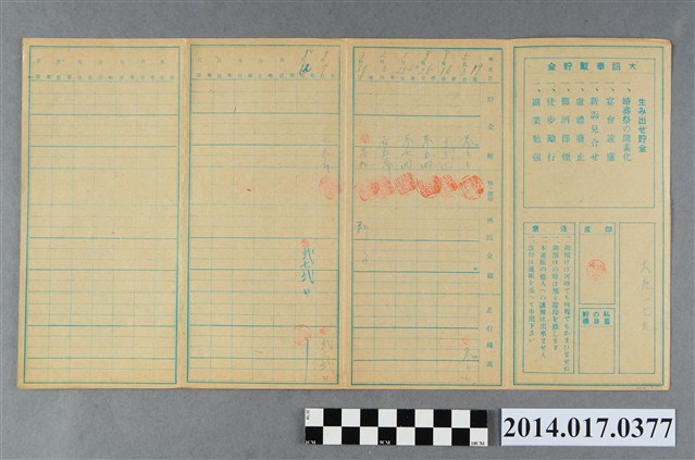 地址處載有大庄179。本物件為戰爭期間1943年~1945年期間後龍、公司寮、水尾子、二張犁、大山腳、頭湖、崎頂等地人民之銷帳儲金簿,內頁印有大詔奉戴字樣,並以婚葬儀式簡化、宴會遠慮、新謁見合せ、虛禮廢止、節酒節煙、徒步勵行、副業勉強倡導儲金,另外印有儲簿規定如:不許轉讓、改印需申請等,背頁附有複利合計表。大詔指的是1941年對美、英兩國之宣戰詔書,1942年起每個月8日定為大詔奉戴日,為日本政府為太平洋戰爭所運作的國民運動,隨著戰爭規模擴大,戰時有各項國民強迫儲蓄的舉措,以支援前線戰事,1938年日本政府為因應中日戰爭即推行有愛國儲蓄運動,本物件則為1942年後因應戰爭規模擴大後之儲蓄項目,范雅鈞指出本儲金簿為強制存款,直接由薪資扣除。