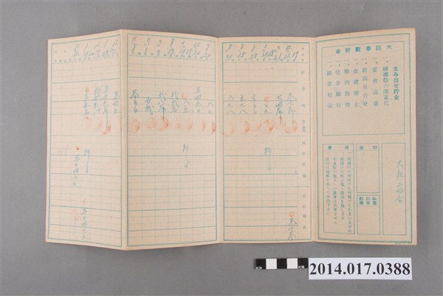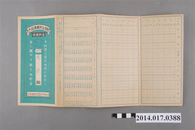 地址載為大庄246。本物件為戰爭期間1943年~1945年期間後龍、公司寮、水尾子、二張犁、大山腳、頭湖、崎頂等地人民之銷帳儲金簿,內頁印有大詔奉戴字樣,並以婚葬儀式簡化、宴會遠慮、新謁見合せ、虛禮廢止、節酒節煙、徒步勵行、副業勉強倡導儲金,另外印有儲簿規定如:不許轉讓、改印需申請等,背頁附有複利合計表。大詔指的是1941年對美、英兩國之宣戰詔書,1942年起每個月8日定為大詔奉戴日,為日本政府為太平洋戰爭所運作的國民運動,隨著戰爭規模擴大,戰時有各項國民強迫儲蓄的舉措,以支援前線戰事,1938年日本政府為因應中日戰爭即推行有愛國儲蓄運動,本物件則為1942年後因應戰爭規模擴大後之儲蓄項目,范雅鈞指出本儲金簿為強制存款,直接由薪資扣除。