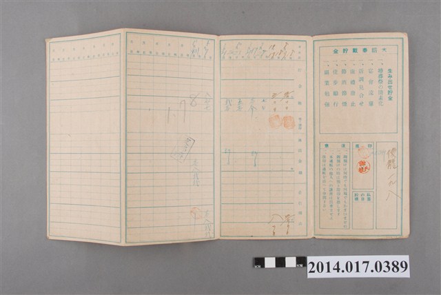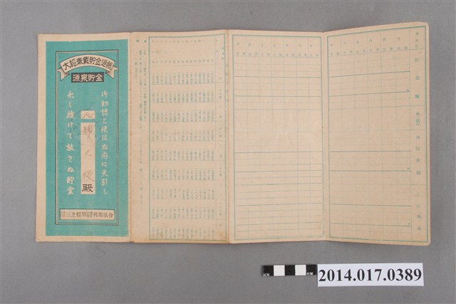 地址載為後龍198。本物件為戰爭期間1943年~1945年期間後龍、公司寮、水尾子、二張犁、大山腳、頭湖、崎頂等地人民之銷帳儲金簿,內頁印有大詔奉戴字樣,並以婚葬儀式簡化、宴會遠慮、新謁見合せ、虛禮廢止、節酒節煙、徒步勵行、副業勉強倡導儲金,另外印有儲簿規定如:不許轉讓、改印需申請等,背頁附有複利合計表。大詔指的是1941年對美、英兩國之宣戰詔書,1942年起每個月8日定為大詔奉戴日,為日本政府為太平洋戰爭所運作的國民運動,隨著戰爭規模擴大,戰時有各項國民強迫儲蓄的舉措,以支援前線戰事,1938年日本政府為因應中日戰爭即推行有愛國儲蓄運動,本物件則為1942年後因應戰爭規模擴大後之儲蓄項目,范雅鈞指出本儲金簿為強制存款,直接由薪資扣除。