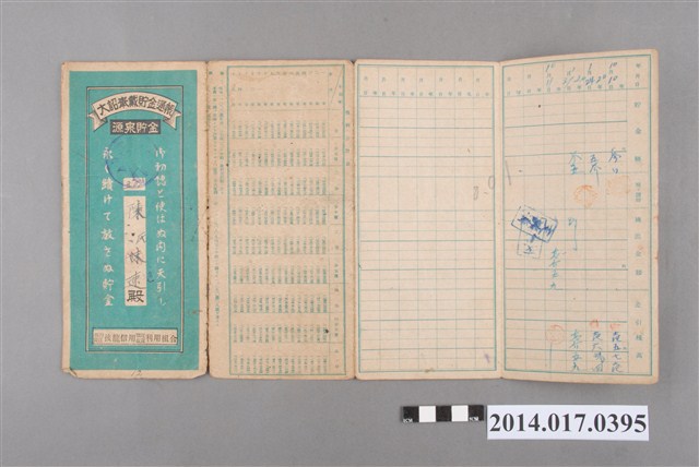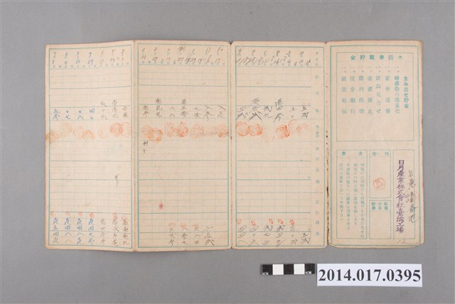 印有日月產業臺灣工廠印,地址載為後龍170番地。本物件為戰爭期間1943年~1945年期間後龍、公司寮、水尾子、二張犁、大山腳、頭湖、崎頂等地人民之銷帳儲金簿,內頁印有大詔奉戴字樣,並以婚葬儀式簡化、宴會遠慮、新謁見合せ、虛禮廢止、節酒節煙、徒步勵行、副業勉強倡導儲金,另外印有儲簿規定如:不許轉讓、改印需申請等,背頁附有複利合計表。大詔指的是1941年對美、英兩國之宣戰詔書,1942年起每個月8日定為大詔奉戴日,為日本政府為太平洋戰爭所運作的國民運動,隨著戰爭規模擴大,戰時有各項國民強迫儲蓄的舉措,以支援前線戰事,1938年日本政府為因應中日戰爭即推行有愛國儲蓄運動,本物件則為1942年後因應戰爭規模擴大後之儲蓄項目,范雅鈞指出本儲金簿為強制存款,直接由薪資扣除。
