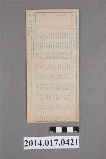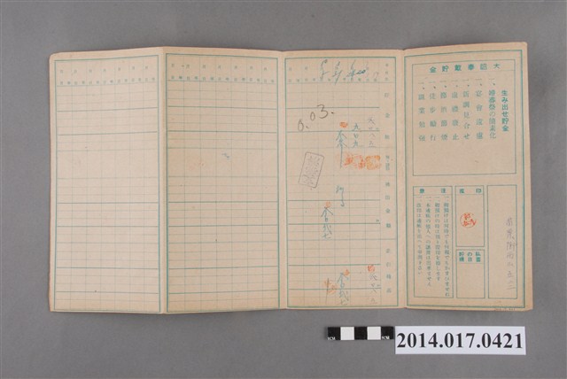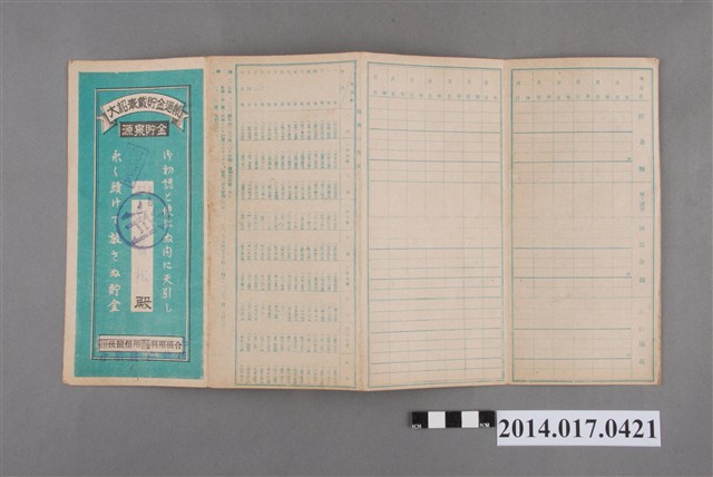 地址處載有苗栗街西山522。本物件為戰爭期間1943年~1945年期間後龍、公司寮、水尾子、二張犁、大山腳、頭湖、崎頂等地人民之銷帳儲金簿,內頁印有大詔奉戴字樣,並以婚葬儀式簡化、宴會遠慮、新謁見合せ、虛禮廢止、節酒節煙、徒步勵行、副業勉強倡導儲金,另外印有儲簿規定如:不許轉讓、改印需申請等,背頁附有複利合計表。大詔指的是1941年對美、英兩國之宣戰詔書,1942年起每個月8日定為大詔奉戴日,為日本政府為太平洋戰爭所運作的國民運動,隨著戰爭規模擴大,戰時有各項國民強迫儲蓄的舉措,以支援前線戰事,1938年日本政府為因應中日戰爭即推行有愛國儲蓄運動,本物件則為1942年後因應戰爭規模擴大後之儲蓄項目,范雅鈞指出本儲金簿為強制存款,直接由薪資扣除。