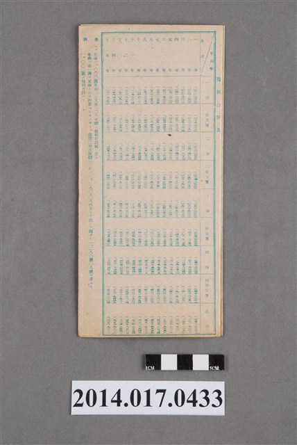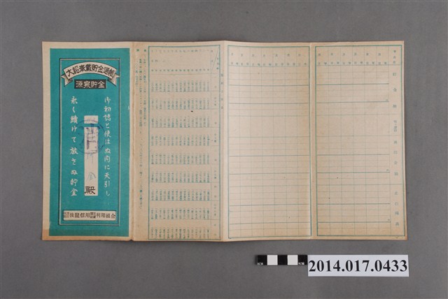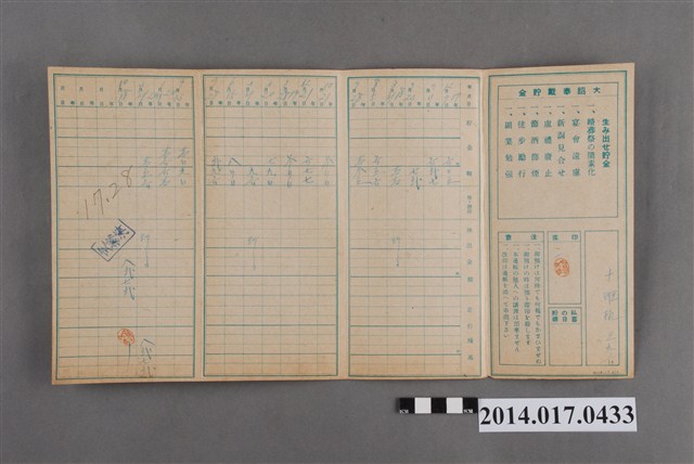 地址載為十班坑396。本物件為戰爭期間1943年~1945年期間後龍、公司寮、水尾子、二張犁、大山腳、頭湖、崎頂等地人民之銷帳儲金簿,內頁印有大詔奉戴字樣,並以婚葬儀式簡化、宴會遠慮、新謁見合せ、虛禮廢止、節酒節煙、徒步勵行、副業勉強倡導儲金,另外印有儲簿規定如:不許轉讓、改印需申請等,背頁附有複利合計表。大詔指的是1941年對美、英兩國之宣戰詔書,1942年起每個月8日定為大詔奉戴日,為日本政府為太平洋戰爭所運作的國民運動,隨著戰爭規模擴大,戰時有各項國民強迫儲蓄的舉措,以支援前線戰事,1938年日本政府為因應中日戰爭即推行有愛國儲蓄運動,本物件則為1942年後因應戰爭規模擴大後之儲蓄項目,范雅鈞指出本儲金簿為強制存款,直接由薪資扣除。