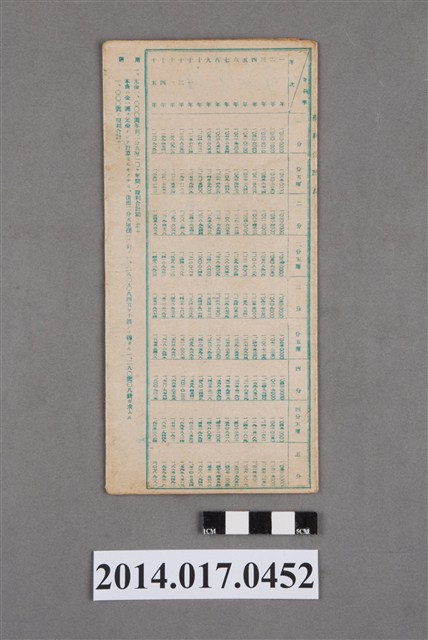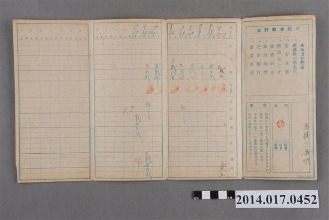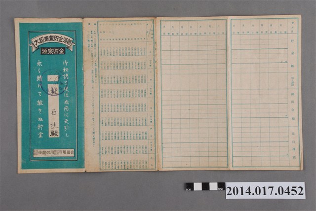 地址載為烏眉12番地。本物件為戰爭期間1943年~1945年期間後龍、公司寮、水尾子、二張犁、大山腳、頭湖、崎頂等地人民之銷帳儲金簿,內頁印有大詔奉戴字樣,並以婚葬儀式簡化、宴會遠慮、新謁見合せ、虛禮廢止、節酒節煙、徒步勵行、副業勉強倡導儲金,另外印有儲簿規定如:不許轉讓、改印需申請等,背頁附有複利合計表。大詔指的是1941年對美、英兩國之宣戰詔書,1942年起每個月8日定為大詔奉戴日,為日本政府為太平洋戰爭所運作的國民運動,隨著戰爭規模擴大,戰時有各項國民強迫儲蓄的舉措,以支援前線戰事,1938年日本政府為因應中日戰爭即推行有愛國儲蓄運動,本物件則為1942年後因應戰爭規模擴大後之儲蓄項目,范雅鈞指出本儲金簿為強制存款,直接由薪資扣除。