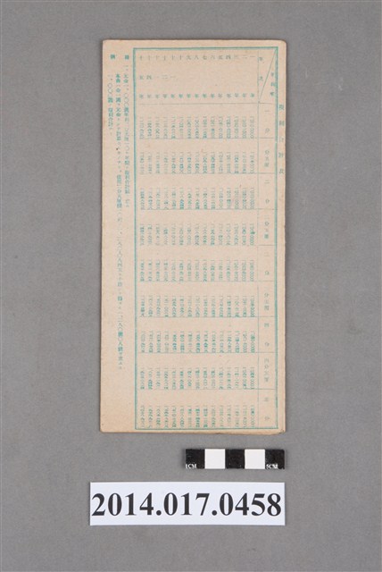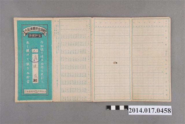 地址載為頭湖63番地。本物件為戰爭期間1943年~1945年期間後龍、公司寮、水尾子、二張犁、大山腳、頭湖、崎頂等地人民之銷帳儲金簿,內頁印有大詔奉戴字樣,並以婚葬儀式簡化、宴會遠慮、新謁見合せ、虛禮廢止、節酒節煙、徒步勵行、副業勉強倡導儲金,另外印有儲簿規定如:不許轉讓、改印需申請等,背頁附有複利合計表。大詔指的是1941年對美、英兩國之宣戰詔書,1942年起每個月8日定為大詔奉戴日,為日本政府為太平洋戰爭所運作的國民運動,隨著戰爭規模擴大,戰時有各項國民強迫儲蓄的舉措,以支援前線戰事,1938年日本政府為因應中日戰爭即推行有愛國儲蓄運動,本物件則為1942年後因應戰爭規模擴大後之儲蓄項目,范雅鈞指出本儲金簿為強制存款,直接由薪資扣除。