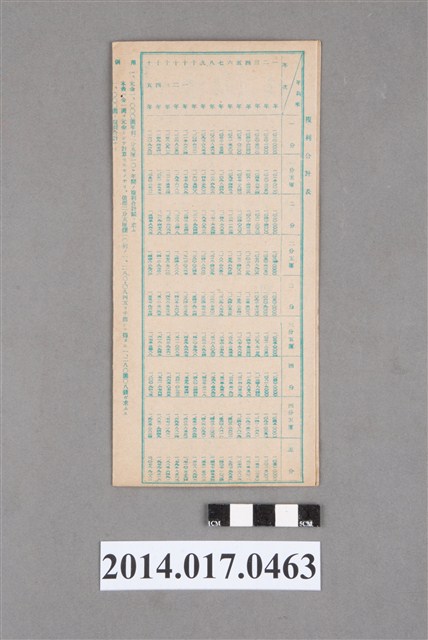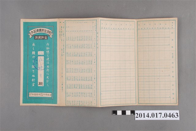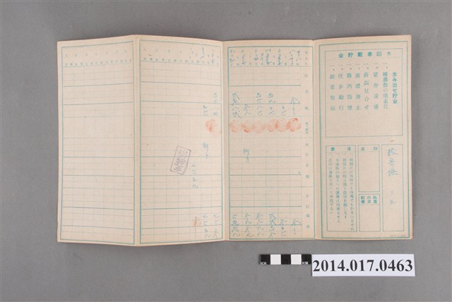 地址載為校寄?33。本物件為戰爭期間1943年~1945年期間後龍、公司寮、水尾子、二張犁、大山腳、頭湖、崎頂等地人民之銷帳儲金簿,內頁印有大詔奉戴字樣,並以婚葬儀式簡化、宴會遠慮、新謁見合せ、虛禮廢止、節酒節煙、徒步勵行、副業勉強倡導儲金,另外印有儲簿規定如:不許轉讓、改印需申請等,背頁附有複利合計表。大詔指的是1941年對美、英兩國之宣戰詔書,1942年起每個月8日定為大詔奉戴日,為日本政府為太平洋戰爭所運作的國民運動,隨著戰爭規模擴大,戰時有各項國民強迫儲蓄的舉措,以支援前線戰事,1938年日本政府為因應中日戰爭即推行有愛國儲蓄運動,本物件則為1942年後因應戰爭規模擴大後之儲蓄項目,范雅鈞指出本儲金簿為強制存款,直接由薪資扣除。