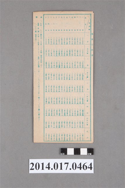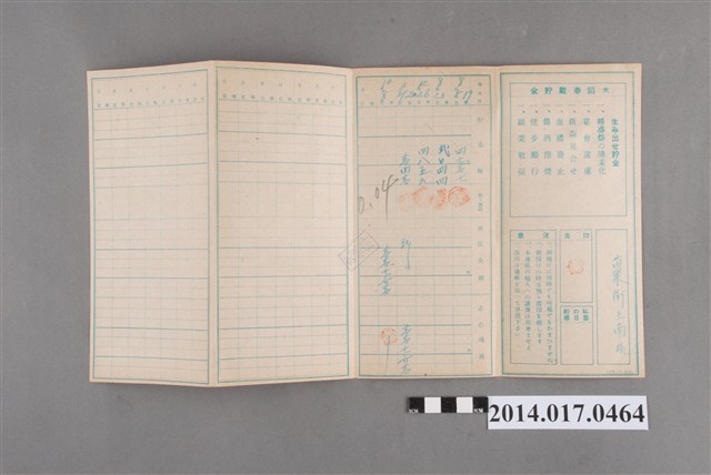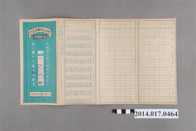 姓名欄中姓氏辨識不清。地址載為苗栗街上南坑。本物件為戰爭期間1943年~1945年期間後龍、公司寮、水尾子、二張犁、大山腳、頭湖、崎頂等地人民之銷帳儲金簿,內頁印有大詔奉戴字樣,並以婚葬儀式簡化、宴會遠慮、新謁見合せ、虛禮廢止、節酒節煙、徒步勵行、副業勉強倡導儲金,另外印有儲簿規定如:不許轉讓、改印需申請等,背頁附有複利合計表。大詔指的是1941年對美、英兩國之宣戰詔書,1942年起每個月8日定為大詔奉戴日,為日本政府為太平洋戰爭所運作的國民運動,隨著戰爭規模擴大,戰時有各項國民強迫儲蓄的舉措,以支援前線戰事,1938年日本政府為因應中日戰爭即推行有愛國儲蓄運動,本物件則為1942年後因應戰爭規模擴大後之儲蓄項目,范雅鈞指出本儲金簿為強制存款,直接由薪資扣除。