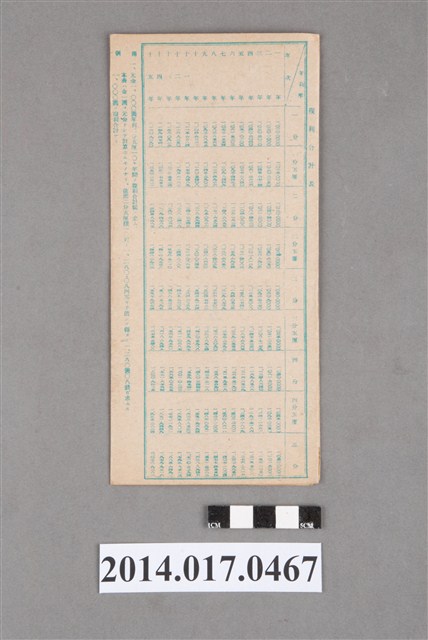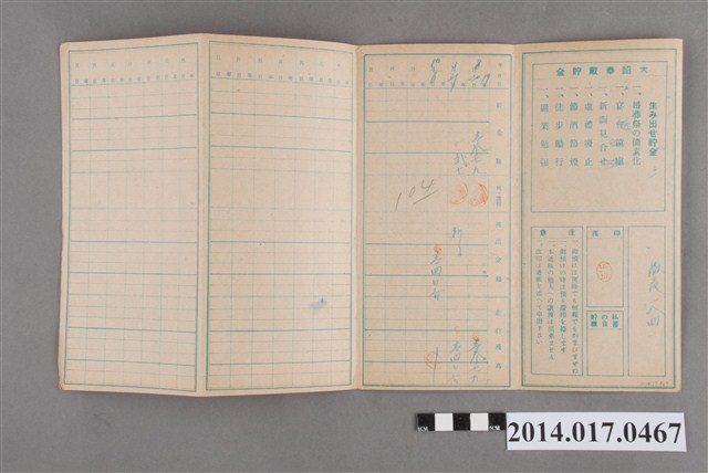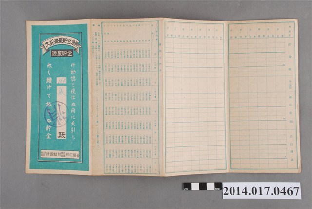 地址載為後龍184。本物件為戰爭期間1943年~1945年期間後龍、公司寮、水尾子、二張犁、大山腳、頭湖、崎頂等地人民之銷帳儲金簿,內頁印有大詔奉戴字樣,並以婚葬儀式簡化、宴會遠慮、新謁見合せ、虛禮廢止、節酒節煙、徒步勵行、副業勉強倡導儲金,另外印有儲簿規定如:不許轉讓、改印需申請等,背頁附有複利合計表。大詔指的是1941年對美、英兩國之宣戰詔書,1942年起每個月8日定為大詔奉戴日,為日本政府為太平洋戰爭所運作的國民運動,隨著戰爭規模擴大,戰時有各項國民強迫儲蓄的舉措,以支援前線戰事,1938年日本政府為因應中日戰爭即推行有愛國儲蓄運動,本物件則為1942年後因應戰爭規模擴大後之儲蓄項目,范雅鈞指出本儲金簿為強制存款,直接由薪資扣除。