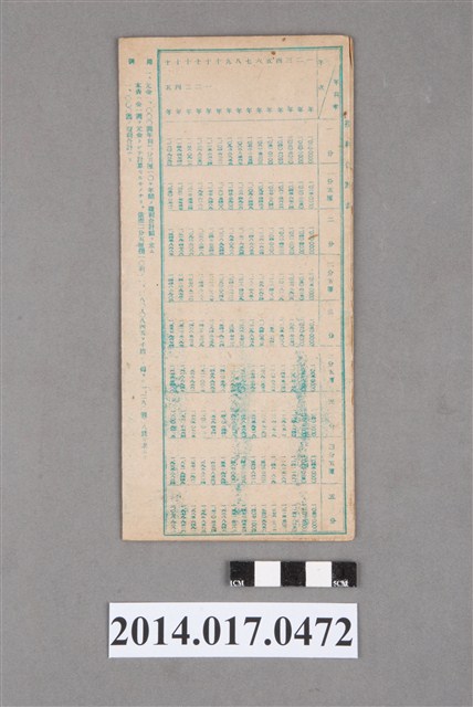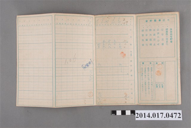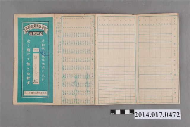 姓名欄中姓氏辨識不清。本物件為戰爭期間1943年~1945年期間後龍、公司寮、水尾子、二張犁、大山腳、頭湖、崎頂等地人民之銷帳儲金簿,內頁印有大詔奉戴字樣,並以婚葬儀式簡化、宴會遠慮、新謁見合せ、虛禮廢止、節酒節煙、徒步勵行、副業勉強倡導儲金,另外印有儲簿規定如:不許轉讓、改印需申請等,背頁附有複利合計表。大詔指的是1941年對美、英兩國之宣戰詔書,1942年起每個月8日定為大詔奉戴日,為日本政府為太平洋戰爭所運作的國民運動,隨著戰爭規模擴大,戰時有各項國民強迫儲蓄的舉措,以支援前線戰事,1938年日本政府為因應中日戰爭即推行有愛國儲蓄運動,本物件則為1942年後因應戰爭規模擴大後之儲蓄項目,范雅鈞指出本儲金簿為強制存款,直接由薪資扣除。