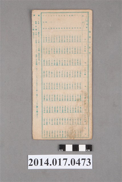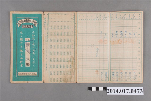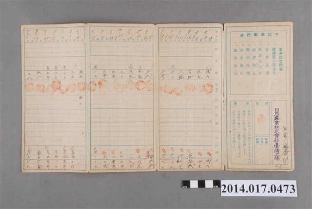 地址處印有日月產業株式會社臺灣工廠印,地址載有後龍163番地。本物件為戰爭期間1943年~1945年期間後龍、公司寮、水尾子、二張犁、大山腳、頭湖、崎頂等地人民之銷帳儲金簿,內頁印有大詔奉戴字樣,並以婚葬儀式簡化、宴會遠慮、新謁見合せ、虛禮廢止、節酒節煙、徒步勵行、副業勉強倡導儲金,另外印有儲簿規定如:不許轉讓、改印需申請等,背頁附有複利合計表。大詔指的是1941年對美、英兩國之宣戰詔書,1942年起每個月8日定為大詔奉戴日,為日本政府為太平洋戰爭所運作的國民運動,隨著戰爭規模擴大,戰時有各項國民強迫儲蓄的舉措,以支援前線戰事,1938年日本政府為因應中日戰爭即推行有愛國儲蓄運動,本物件則為1942年後因應戰爭規模擴大後之儲蓄項目,范雅鈞指出本儲金簿為強制存款,直接由薪資扣除。