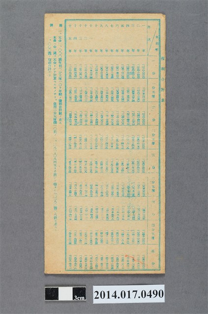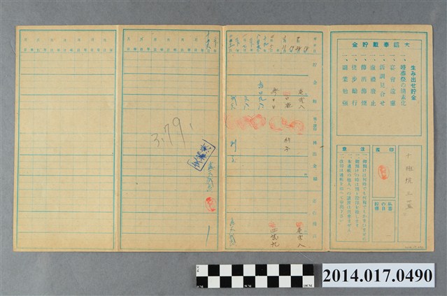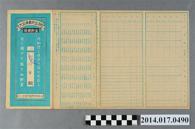 地址登載為十班坑315。本物件為戰爭期間1943年~1945年期間後龍、公司寮、水尾子、二張犁、大山腳、頭湖、崎頂等地人民之銷帳儲金簿,內頁印有大詔奉戴字樣,並以婚葬儀式簡化、宴會遠慮、新謁見合せ、虛禮廢止、節酒節煙、徒步勵行、副業勉強倡導儲金,另外印有儲簿規定如:不許轉讓、改印需申請等,背頁附有複利合計表。大詔指的是1941年對美、英兩國之宣戰詔書,1942年起每個月8日定為大詔奉戴日,為日本政府為太平洋戰爭所運作的國民運動,隨著戰爭規模擴大,戰時有各項國民強迫儲蓄的舉措,以支援前線戰事,1938年日本政府為因應中日戰爭即推行有愛國儲蓄運動,本物件則為1942年後因應戰爭規模擴大後之儲蓄項目,范雅鈞指出本儲金簿為強制存款,直接由薪資扣除。