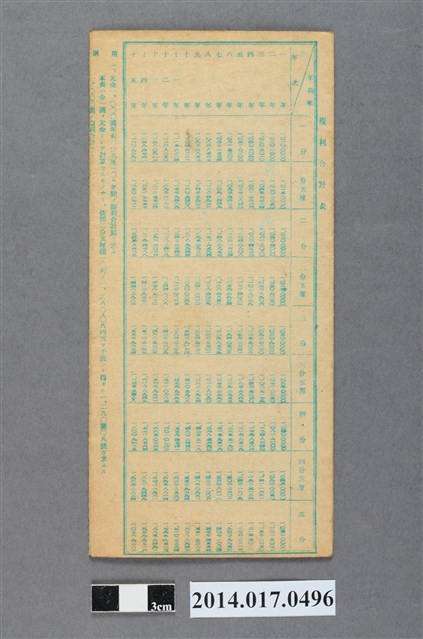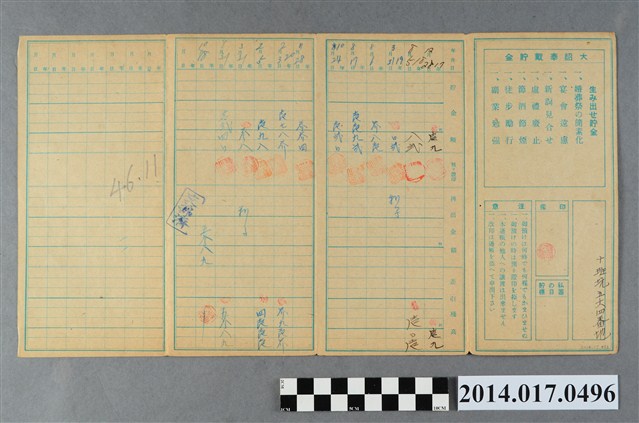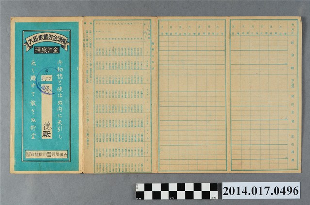 地址登載為十班坑564番地。本物件為戰爭期間1943年~1945年期間後龍、公司寮、水尾子、二張犁、大山腳、頭湖、崎頂等地人民之銷帳儲金簿,內頁印有大詔奉戴字樣,並以婚葬儀式簡化、宴會遠慮、新謁見合せ、虛禮廢止、節酒節煙、徒步勵行、副業勉強倡導儲金,另外印有儲簿規定如:不許轉讓、改印需申請等,背頁附有複利合計表。大詔指的是1941年對美、英兩國之宣戰詔書,1942年起每個月8日定為大詔奉戴日,為日本政府為太平洋戰爭所運作的國民運動,隨著戰爭規模擴大,戰時有各項國民強迫儲蓄的舉措,以支援前線戰事,1938年日本政府為因應中日戰爭即推行有愛國儲蓄運動,本物件則為1942年後因應戰爭規模擴大後之儲蓄項目,范雅鈞指出本儲金簿為強制存款,直接由薪資扣除。