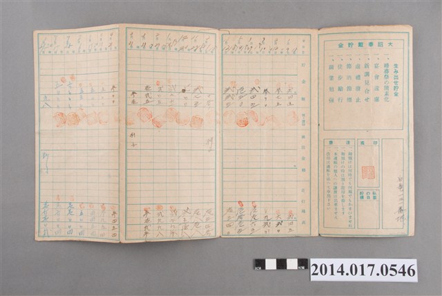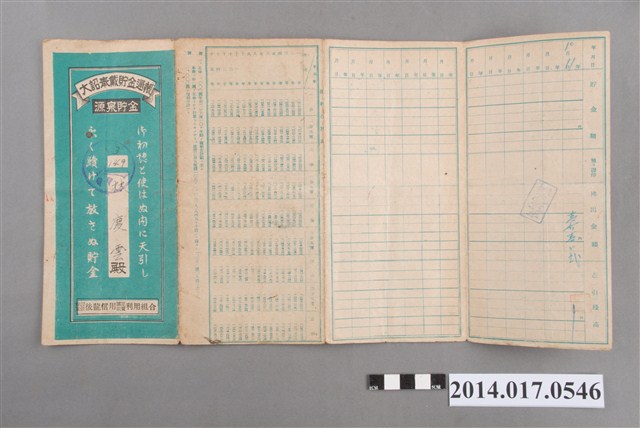 地址登載為後龍131番地。本物件為戰爭期間1943年~1945年期間後龍、公司寮、水尾子、二張犁、大山腳、頭湖、崎頂等地人民之銷帳儲金簿,內頁印有大詔奉戴字樣,並以婚葬儀式簡化、宴會遠慮、新謁見合せ、虛禮廢止、節酒節煙、徒步勵行、副業勉強倡導儲金,另外印有儲簿規定如:不許轉讓、改印需申請等,背頁附有複利合計表。大詔指的是1941年對美、英兩國之宣戰詔書,1942年起每個月8日定為大詔奉戴日,為日本政府為太平洋戰爭所運作的國民運動,隨著戰爭規模擴大,戰時有各項國民強迫儲蓄的舉措,以支援前線戰事,1938年日本政府為因應中日戰爭即推行有愛國儲蓄運動,本物件則為1942年後因應戰爭規模擴大後之儲蓄項目,范雅鈞指出本儲金簿為強制存款,直接由薪資扣除。