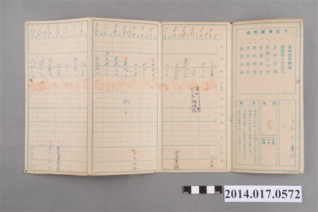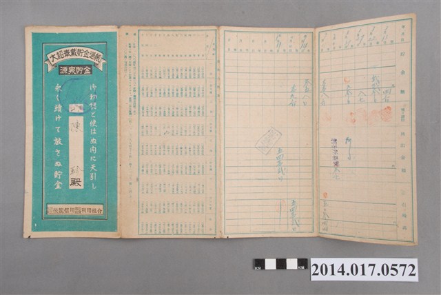 地址載為大庄92番地。本物件為戰爭期間1943年~1945年期間後龍、公司寮、水尾子、二張犁、大山腳、頭湖、崎頂等地人民之銷帳儲金簿,內頁印有大詔奉戴字樣,並以婚葬儀式簡化、宴會遠慮、新謁見合せ、虛禮廢止、節酒節煙、徒步勵行、副業勉強倡導儲金,另外印有儲簿規定如:不許轉讓、改印需申請等,背頁附有複利合計表。大詔指的是1941年對美、英兩國之宣戰詔書,1942年起每個月8日定為大詔奉戴日,為日本政府為太平洋戰爭所運作的國民運動,隨著戰爭規模擴大,戰時有各項國民強迫儲蓄的舉措,以支援前線戰事,1938年日本政府為因應中日戰爭即推行有愛國儲蓄運動,本物件則為1942年後因應戰爭規模擴大後之儲蓄項目,范雅鈞指出本儲金簿為強制存款,直接由薪資扣除。
