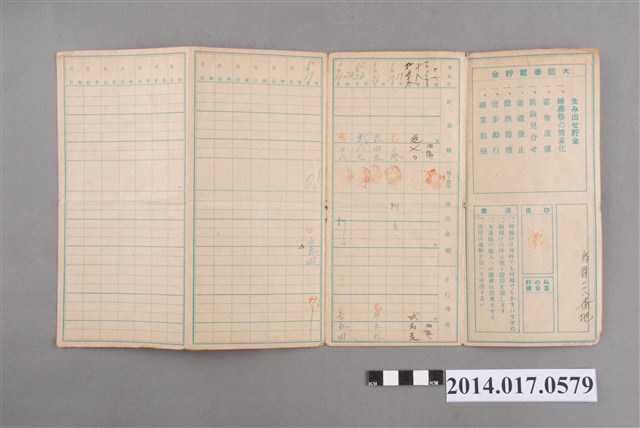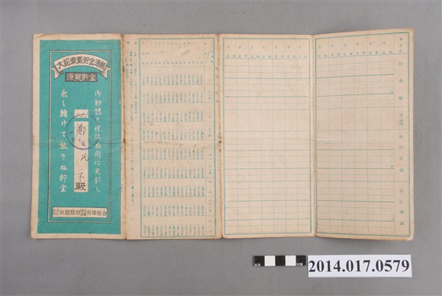 地址載為烏眉228番地。本物件為戰爭期間1943年~1945年期間後龍、公司寮、水尾子、二張犁、大山腳、頭湖、崎頂等地人民之銷帳儲金簿,內頁印有大詔奉戴字樣,並以婚葬儀式簡化、宴會遠慮、新謁見合せ、虛禮廢止、節酒節煙、徒步勵行、副業勉強倡導儲金,另外印有儲簿規定如:不許轉讓、改印需申請等,背頁附有複利合計表。大詔指的是1941年對美、英兩國之宣戰詔書,1942年起每個月8日定為大詔奉戴日,為日本政府為太平洋戰爭所運作的國民運動,隨著戰爭規模擴大,戰時有各項國民強迫儲蓄的舉措,以支援前線戰事,1938年日本政府為因應中日戰爭即推行有愛國儲蓄運動,本物件則為1942年後因應戰爭規模擴大後之儲蓄項目,范雅鈞指出本儲金簿為強制存款,直接由薪資扣除。