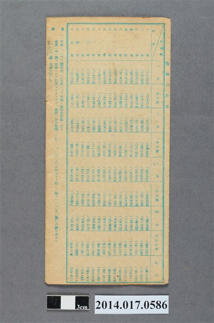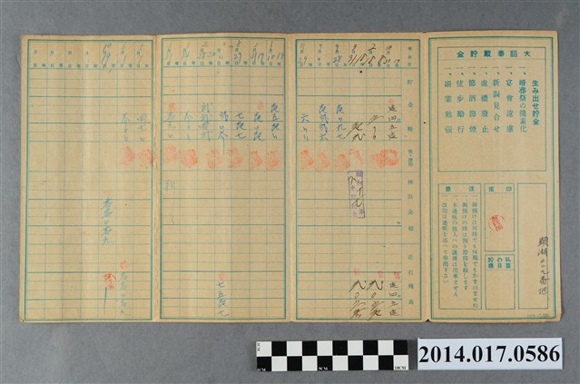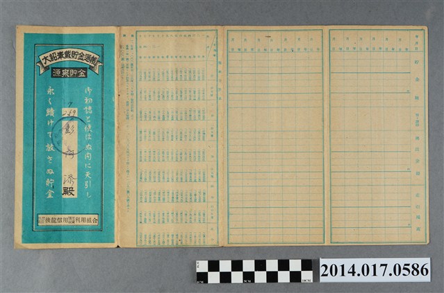 地址載為頭湖329番地。本物件為戰爭期間1943年~1945年期間後龍、公司寮、水尾子、二張犁、大山腳、頭湖、崎頂等地人民之銷帳儲金簿,內頁印有大詔奉戴字樣,並以婚葬儀式簡化、宴會遠慮、新謁見合せ、虛禮廢止、節酒節煙、徒步勵行、副業勉強倡導儲金,另外印有儲簿規定如:不許轉讓、改印需申請等,背頁附有複利合計表。大詔指的是1941年對美、英兩國之宣戰詔書,1942年起每個月8日定為大詔奉戴日,為日本政府為太平洋戰爭所運作的國民運動,隨著戰爭規模擴大,戰時有各項國民強迫儲蓄的舉措,以支援前線戰事,1938年日本政府為因應中日戰爭即推行有愛國儲蓄運動,本物件則為1942年後因應戰爭規模擴大後之儲蓄項目,范雅鈞指出本儲金簿為強制存款,直接由薪資扣除。