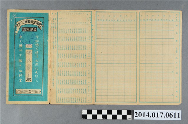 陳發見代印,印有旭東工場印。本物件為戰爭期間1943年~1945年期間後龍、公司寮、水尾子、二張犁、大山腳、頭湖、崎頂等地人民之銷帳儲金簿,內頁印有大詔奉戴字樣,並以婚葬儀式簡化、宴會遠慮、新謁見合せ、虛禮廢止、節酒節煙、徒步勵行、副業勉強倡導儲金,另外印有儲簿規定如:不許轉讓、改印需申請等,背頁附有複利合計表。大詔指的是1941年對美、英兩國之宣戰詔書,1942年起每個月8日定為大詔奉戴日,為日本政府為太平洋戰爭所運作的國民運動,隨著戰爭規模擴大,戰時有各項國民強迫儲蓄的舉措,以支援前線戰事,1938年日本政府為因應中日戰爭即推行有愛國儲蓄運動,本物件則為1942年後因應戰爭規模擴大後之儲蓄項目,范雅鈞指出本儲金簿為強制存款,直接由薪資扣除。