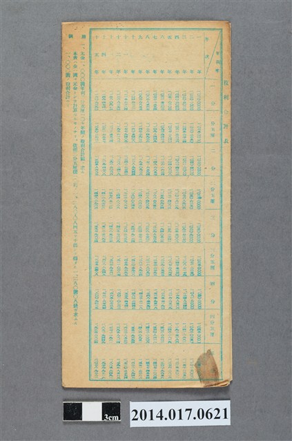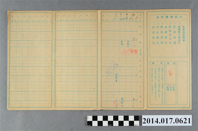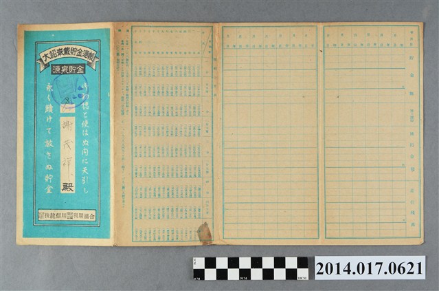 本物件為戰爭期間1943年~1945年期間後龍、公司寮、水尾子、二張犁、大山腳、頭湖、崎頂等地人民之銷帳儲金簿,內頁印有大詔奉戴字樣,並以婚葬儀式簡化、宴會遠慮、新謁見合せ、虛禮廢止、節酒節煙、徒步勵行、副業勉強倡導儲金,另外印有儲簿規定如:不許轉讓、改印需申請等,背頁附有複利合計表。大詔指的是1941年對美、英兩國之宣戰詔書,1942年起每個月8日定為大詔奉戴日,為日本政府為太平洋戰爭所運作的國民運動,隨著戰爭規模擴大,戰時有各項國民強迫儲蓄的舉措,以支援前線戰事,1938年日本政府為因應中日戰爭即推行有愛國儲蓄運動,本物件則為1942年後因應戰爭規模擴大後之儲蓄項目,范雅鈞指出本儲金簿為強制存款,直接由薪資扣除。