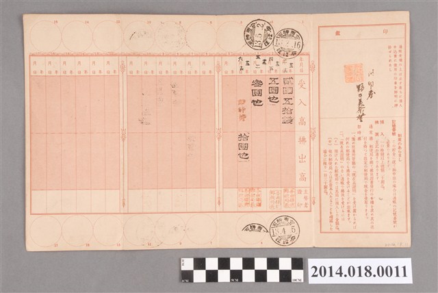 為日治時期野口日出代的郵便貯金通帳,此即為現今所稱的儲金簿。貯金通帳寫有所有者的姓名以及聯絡地址,並記錄了每次儲金的異動時間,且每次的異動都會蓋上「臺南驛前郵便局長」的印章。 此一文物多次蓋有年份13年,因此一文物為與館藏編號103005-0001至103005-0010相同收藏脈絡之文物,推測應為昭和13年(1938)的貯金通帳。