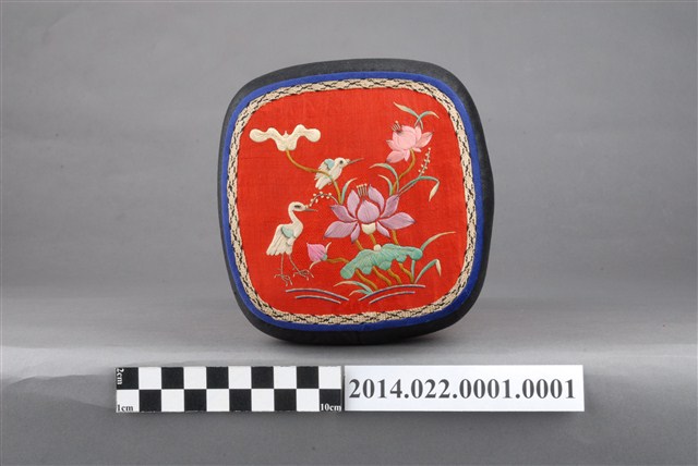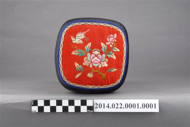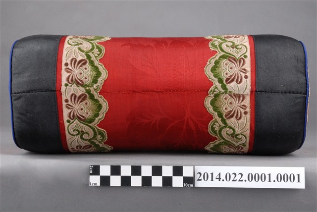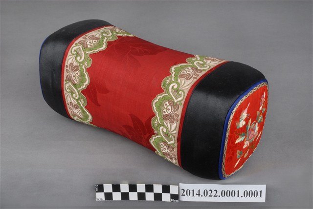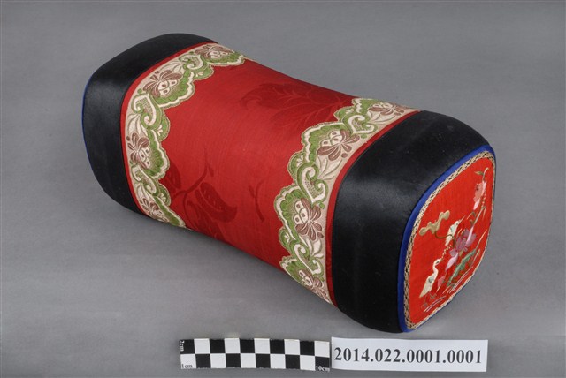 本件心材為木質,外包裹棉布,最外層中段以紅色緹花綢緞布為底,近兩端刺繡彩色花草紋。枕頭兩端則以黑布包裹,端面縫製方形紅底繡花布,繡花圖案一面為牡丹花鳥象徵「花開富貴」,另一面為荷花與鷺鷥象徵「一路榮華」。