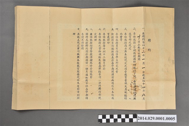 胡宇傑學經歷證明文件簿文件之一,胡先生於民國43年6月18日(1954)於政工幹部學校(現國防大學政治作戰學院)被聘專任一級講師,時任校長王永樹。聘書聘字第64號,物件外型橫式長方輔以正字藍框,捐贈者折疊收藏。