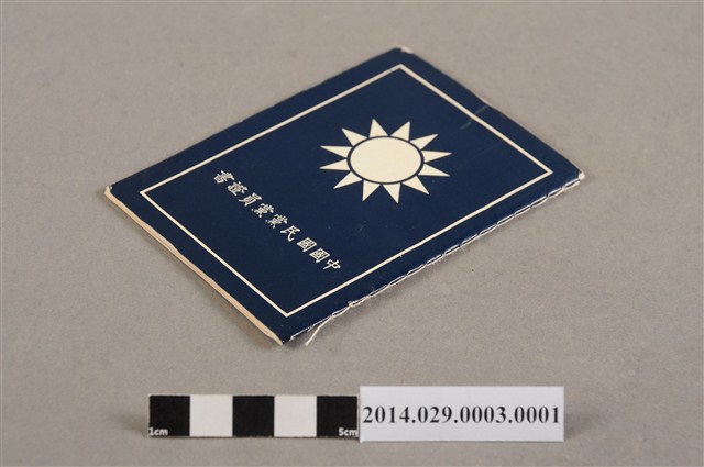 中國國民黨黨中央委員會頒發,組登第18504號,入黨年月民國27年10月(1938),物件外形直式長方深藍底。