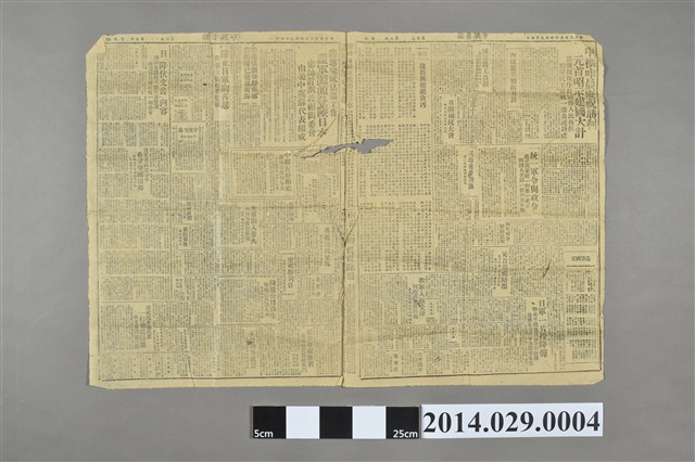民國34年6月4日(1945)中央日報,發行第5910號,當日該報登有胡宇傑先生與李澤信女士訂婚啟事,內容寫有茲承方光孚、張作秋、楊國珍、王瑞華四人介紹於民國34年9月4日在貴陽舉行訂婚典禮等字樣。並且該報當日主要新聞盡皆有收藏。捐贈者摺疊收藏,物件稍有破損,上可辨識內容。