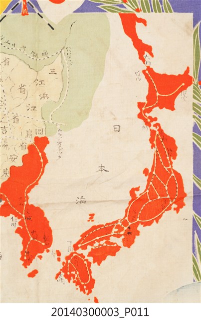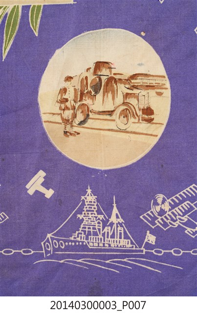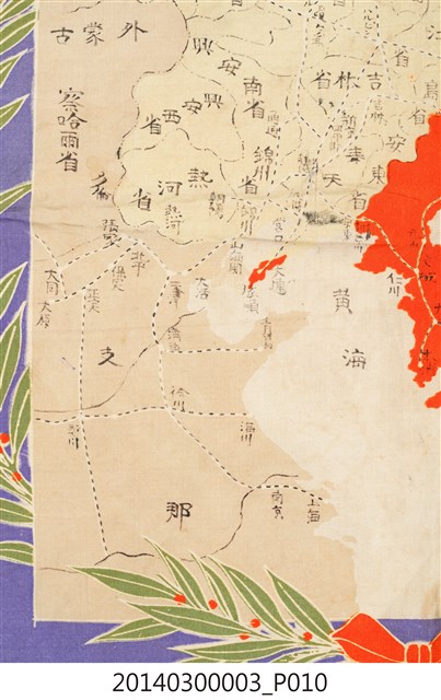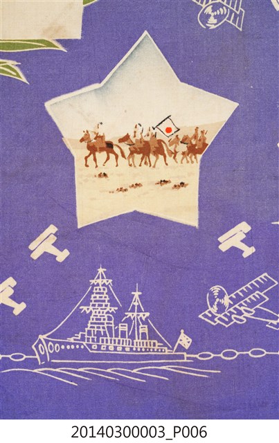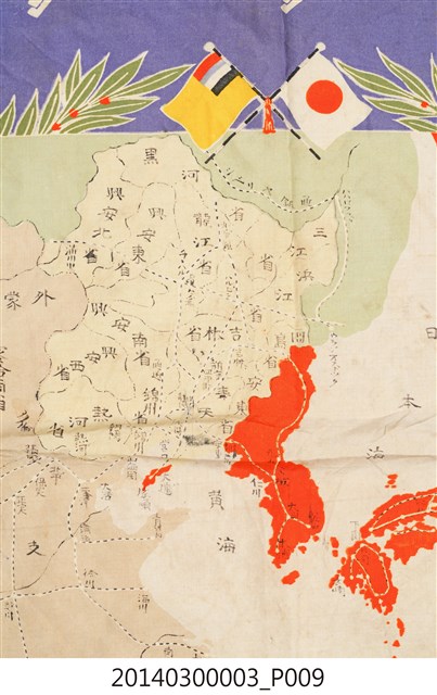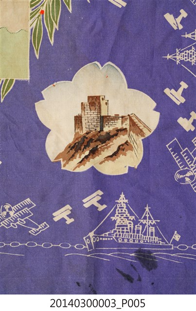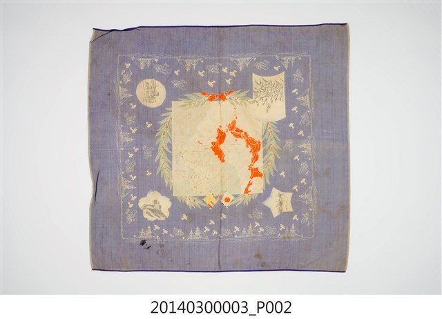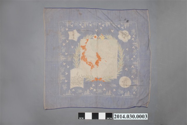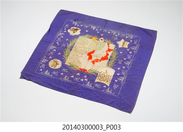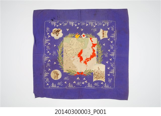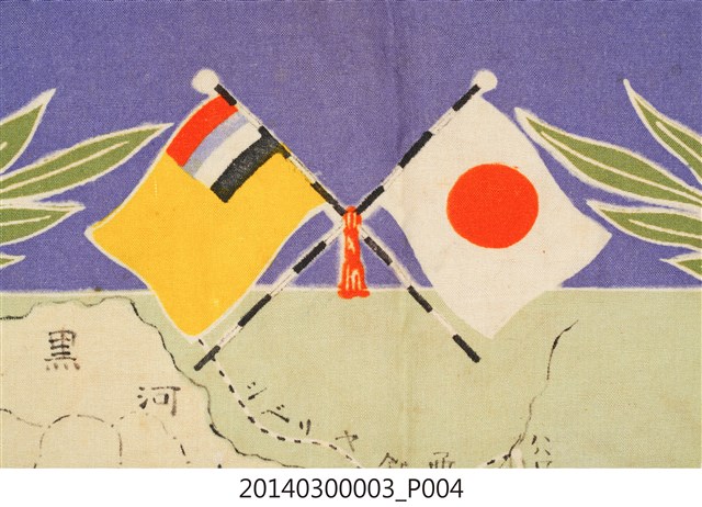 3. 本件推測為1932年日本佔領中國東北地區後,與部分清朝宗室在中國東北地區聯合建立的滿洲國所製作之軍用領巾。為達到使滿洲最終成為日本國土的侵略目標,政治上日本與滿州國保持友好親善關係,扶植清朝遜帝愛新覺羅‧溥儀為滿州國元首,軍事上由日本關東軍控制滿洲,經濟上為滿足日本戰爭經濟的需要,以開發滿洲的名義展開大規模日本人移民滿州活動,並實行「日滿一體」政策,積極開發滿洲國農林漁礦等自然資源,實質上則是使此地區經濟淪為日本經濟的附庸以及掠奪的對象。