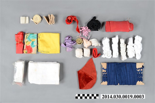 3. 本件另一特色為機身外表磨損十分嚴重,原應有之燙金裝飾圖紋、銅雕飾版因長期使用、磨損,以致器表圓滑金亮,反映出原所有者長期且大量使用磨損之狀態。縫紉機下方木抽屜保存吳錦雪生前使用的針線、拉鍊、鈕扣、線軸、碎布料等縫紉相關用具與耗材。