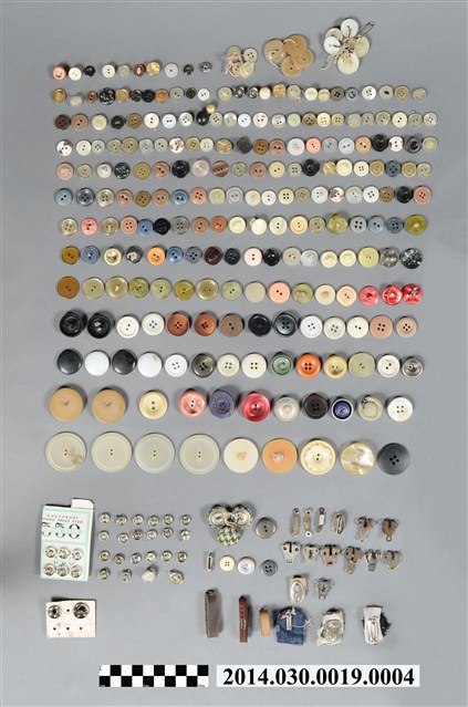 3. 本件另一特色為機身外表磨損十分嚴重,原應有之燙金裝飾圖紋、銅雕飾版因長期使用、磨損,以致器表圓滑金亮,反映出原所有者長期且大量使用磨損之狀態。縫紉機下方木抽屜保存吳錦雪生前使用的針線、拉鍊、鈕扣、線軸、碎布料等縫紉相關用具與耗材。