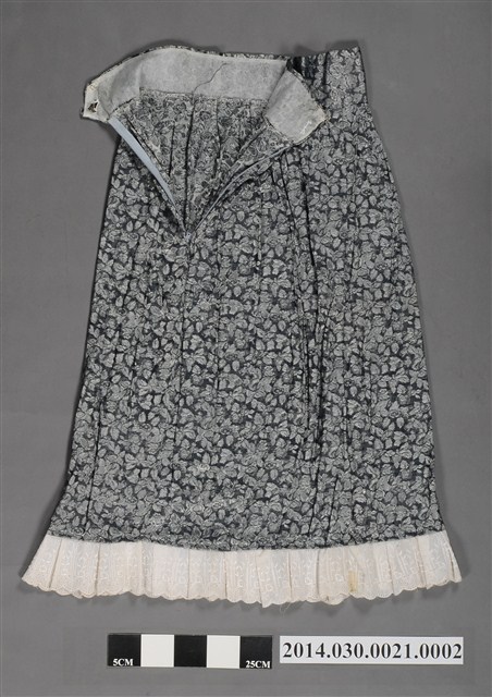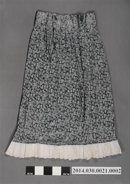 銀灰色緹花棉質及膝短裙,白色蕾絲滾邊。