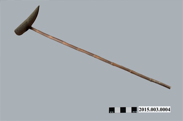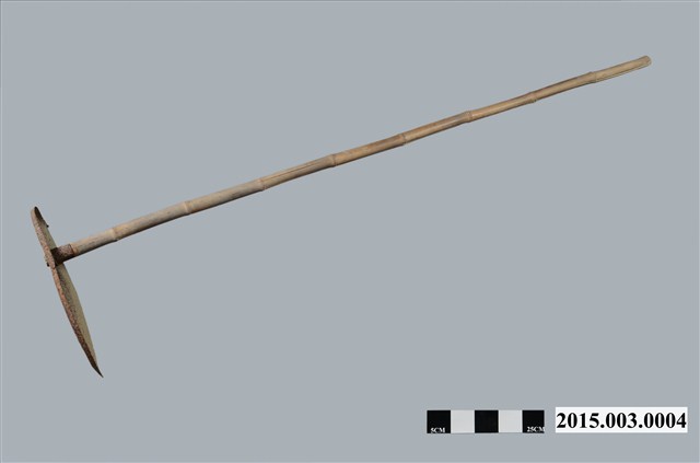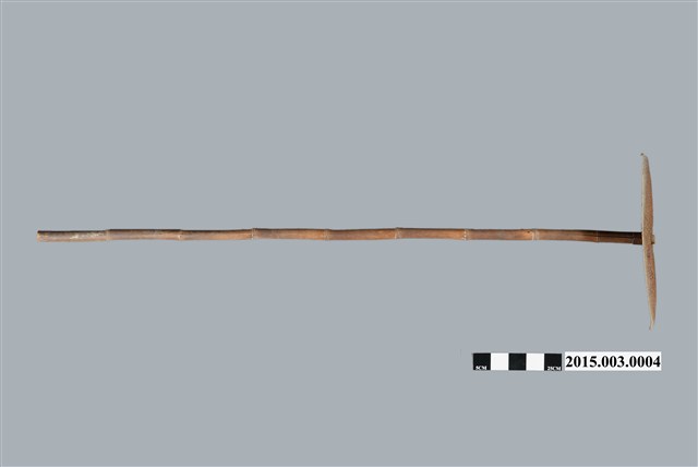 穀耙,又名「粟耙、粟爬、爬不仔」,使用於曬穀時,用來翻穀、扒開穀堆,功能與大拖相同,為稻作收穫用農具。本件為半橢圓狀的薄鐵片耙身與竹製耙柄組成,耙身與耙柄呈85度角。耙身鐵片上凸印有「豐?」字,可能為工具店名或品牌名,下部寬約1尺5寸,後端收成圓筒形與竹柄接頭以釘子固定,屬戰後初期將耙身木板改良為較為輕巧的鐵片的形制,使用於高雄岡山五甲尾地區。