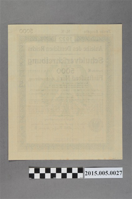 面額上顯示自1925年11月1日起清償,至1930年10月31日償還完畢。德國於1次大戰戰敗,戰後為因應大量戰爭賠償,大量印製鈔票及債券,因此造成通貨膨脹,1923年11月前甚至發行1兆馬克之情形,1923年後重新發行土地馬克等,方才結束通貨膨脹。有一說法為德國賠償當時戰勝國日本此類舊德國馬克,日本政府因此將之轉由殖民地韓國臺灣等地之人民購買吸收。戰後日本政府主張此為貨幣非債券,且政府從未正式公告將此類紙鈔轉售人民,1920年代日本即有德國馬克詐騙事件,推測臺灣也是相關的情形。臺灣方面則有人宣稱當初是殖民政府透過警察及保甲購買此類舊馬克,從1968起年就有人自行與日本官方交涉,1975年起有人自發組團赴日討債,也到內政部和立法院前抗爭十多次,仍無結果。在1984年前後,台日即將交涉成功的傳聞甚囂塵上,造成「舊德國馬克」價格狂飆,又掀起一股搶購熱潮,結果日本政府態度堅決,搶購馬克者慘遭套牢。後來有人組成中華民國研究日據時代德國舊馬克協會,積極組織希望日本賠償,並宣稱日本1964年起已經陸續賠償韓國琉球、菲律賓、馬來西亞、新加坡此類持有馬克「債券」者。根據評估人在臺灣日日新報,也見有1924年開始有人在臺中利用這批馬克進行詐騙之事件,推測日方政府所說應有部分事實根據。根據一些研究之檢證,認為一戰德國總賠償金額原根據1919年巴黎和會初議是1200億馬克 * 600億黃金馬克(Goldmark)+600億紙幣(Papiermark)(而且其中對日賠款部份僅佔0.75%)且其後德國無法順利償還之故,由大債主美國主導下有1924年的道斯計劃,到1929年楊格計畫一路減免其賠償金額,日本也沒可能那麼快入手那麼多馬克。另外日治時期日本政府的確發行過不少國庫債券,但只有以日文書寫日本所發行,由官方推銷印著敵對國且戰敗國的「鈔票」,應該是不太可能。評估人認為這些德國馬克(多數是馬克非債券)極有可能是若干詐騙集團入手這些德國馬克後,至日本及各殖民地進行詐騙的可能較高,此與日本在二戰時發行之債券與儲金問題不可一概而論,日本本國發行債券及儲金問題日本已片面決定賠償比例並陸續要求臺灣持有人提出賠償要求。甚至可能是戰後由於有謠傳日方要賠償此類德國馬克,因此在1980年代又出現一波購買潮。顯示了此類馬克在戰前戰後均有其流行的歷史。