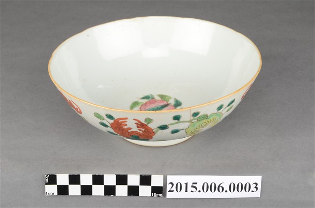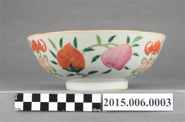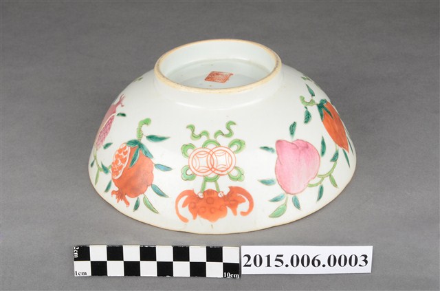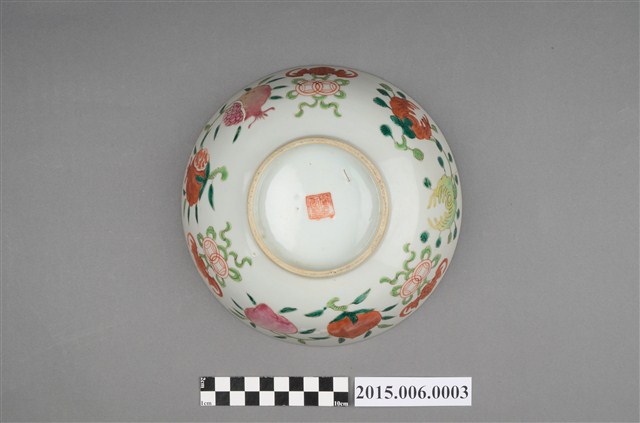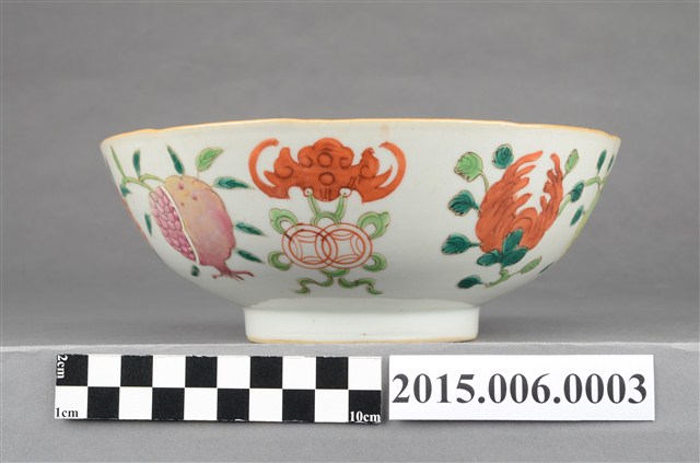 1. 粉彩福壽雙全湯碗,口徑約19公分,器高7公分。碗內底中央以粉彩彩繪蟠桃與桃葉,湯碗外壁以橙紅、粉紅、淺黃、淺綠、墨綠等色粉彩彩繪蝙蝠、雙錢結、佛手瓜、蟠桃等中國傳統吉祥圖案,象徵福壽雙全之意。湯碗口沿帶一圈黃釉,碗底有一0.7公分高之圈足,器底中央蓋有「同治年製」四字篆體方形朱印底款。本件瓷碗作工精細,器壁薄,全件以釉上彩手工彩繪,彩繪圖案輪廓描筆細緻,最細約<1mm,器底圈足底接觸面可見白色胎裡,除接觸面外釉料滿塗。