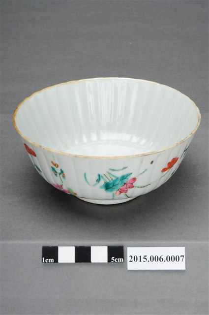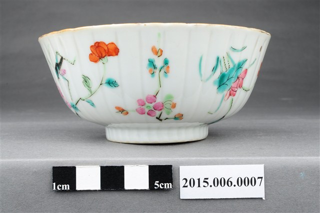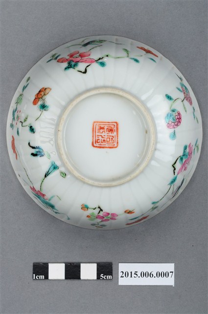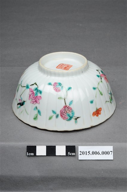 1. 粉彩花卉蟲草紋碗,口徑12公分,器高5公分,為盛裝飯菜用之小碗。胎體薄,碗壁作波浪形淺紋。器身通體施白釉,釉色白皙,並以手工繪製釉上彩及粉彩彩繪。瓷碗內底較平,中央繪蟠桃與桃葉,外壁以橙紅、粉紅、淺黃、淺綠、墨綠等色粉彩繪牡丹、荷花、石榴、桃花等四季花卉及小型昆蟲,象徵吉祥。繪製方式先以細墨筆繪出植物輪廓,再以粉彩顏料塗滿。碗口沿帶有一周黃釉彩,碗底有一0.5公分高之圈足,中央有「同治年制」四字篆體方型朱印底款。本件瓷碗作工良好,器壁甚薄,全件以釉上彩手工彩繪,彩繪圖案輪廓描筆細緻,最細約<1mm,圈足底接觸面可見白色胎裡,除接觸面外釉料滿塗。
