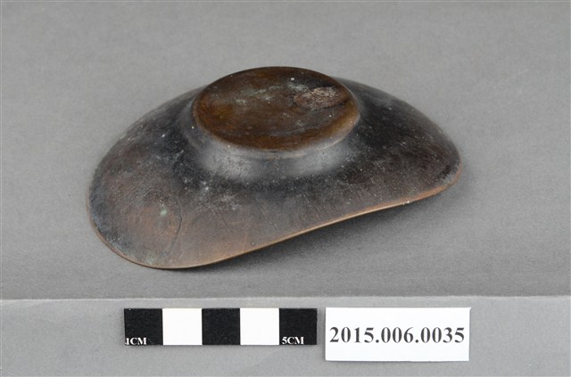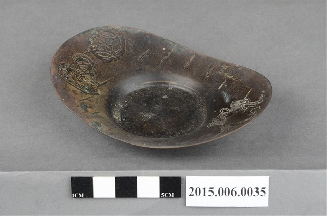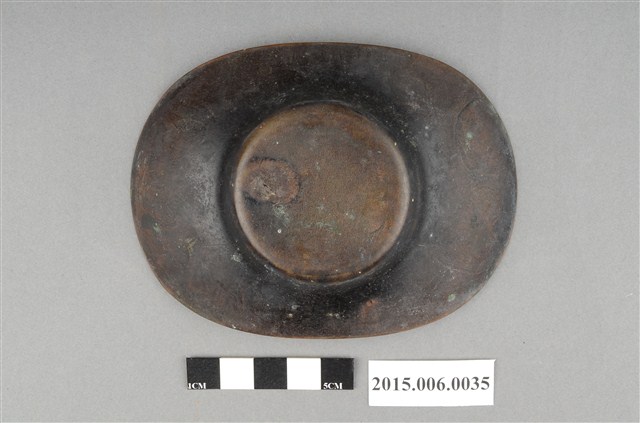 1. 銅質茶托,外型仿日本幕府時代的古錢「小判」橢圓形造型,器身中央有一圓形凹槽,為茶杯放置處,小碟邊緣微微向上翹起,表面有百兩及十兩小判、花卉、法鼓、直線紋等日式鑄造圖案裝飾。茶托底面中央凸起,無任何印記或落款。