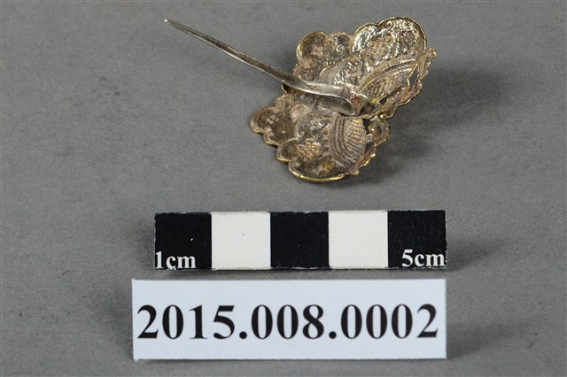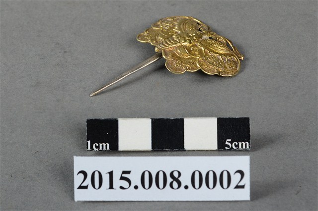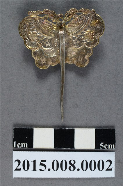 是為美國奧勒岡大學歐獻文教授夫人張敏慧女士所捐。張敏慧女士為臺北大稻埕人士,家裡從事和洋商行。此蝶形髮簪原置於六角錫製粉盒底層,應同為家族內長者所擁有。髮簪本身鍍金漆方式來處理,並主要雕成蝴蝶形狀,蝶翅並有花卉圖紋。