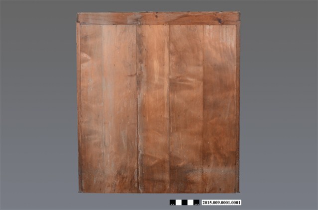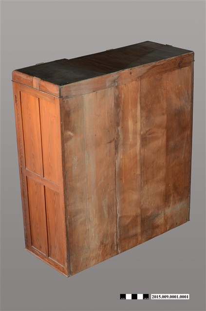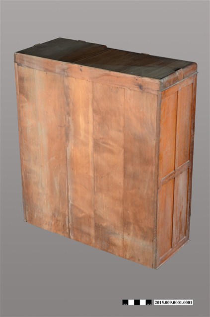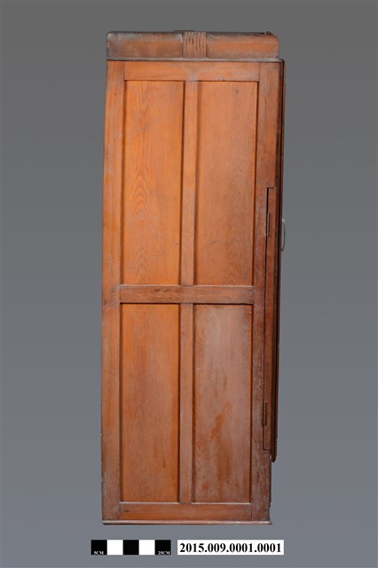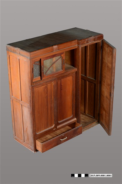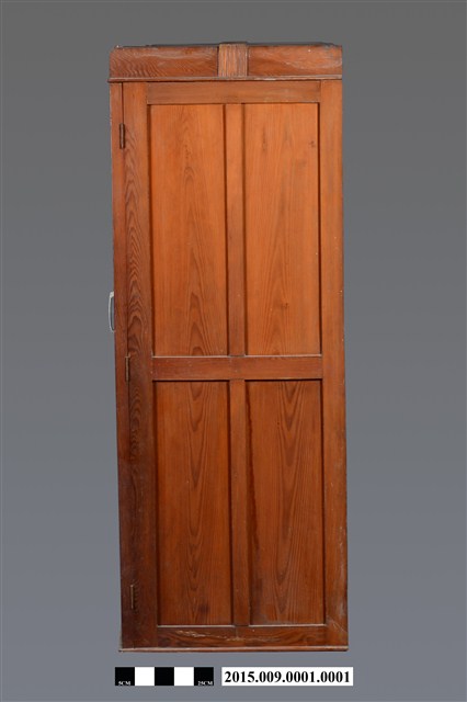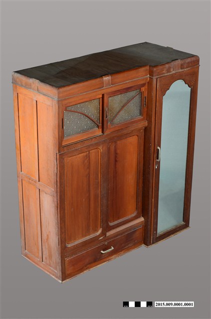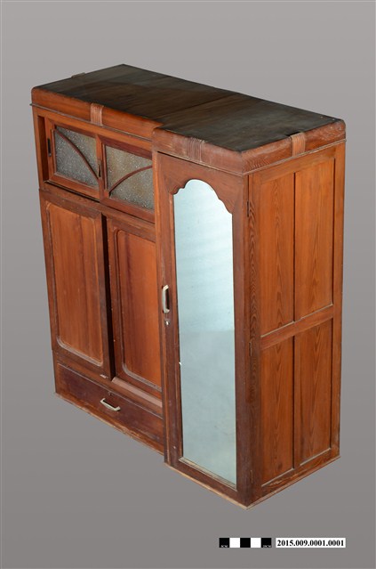 本件為木製4尺衣櫃之上櫥,高約4尺4寸,面寬4尺,頂部裝飾有籐條狀的線腳,形式上分為左、右二部,右部比左部略為凸出,長方形門扇外嵌大長鏡,往外拉開,內部為可懸掛大衣的空間,匙孔為心形。左部分為三層,頂層為鑲著霧玻璃的左右拉門,中層為看似左右拉門,其實是利用巧妙的木工技術,將二片門扇往外拉開,利於拉開內部的3層抽屜,下層則為一抽屜。